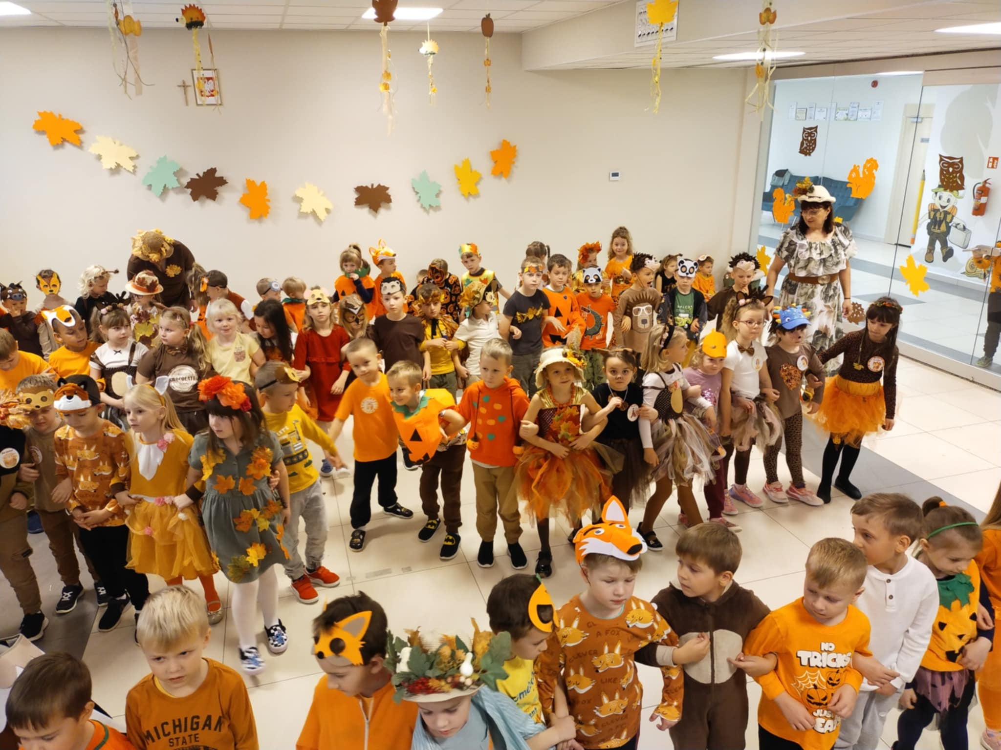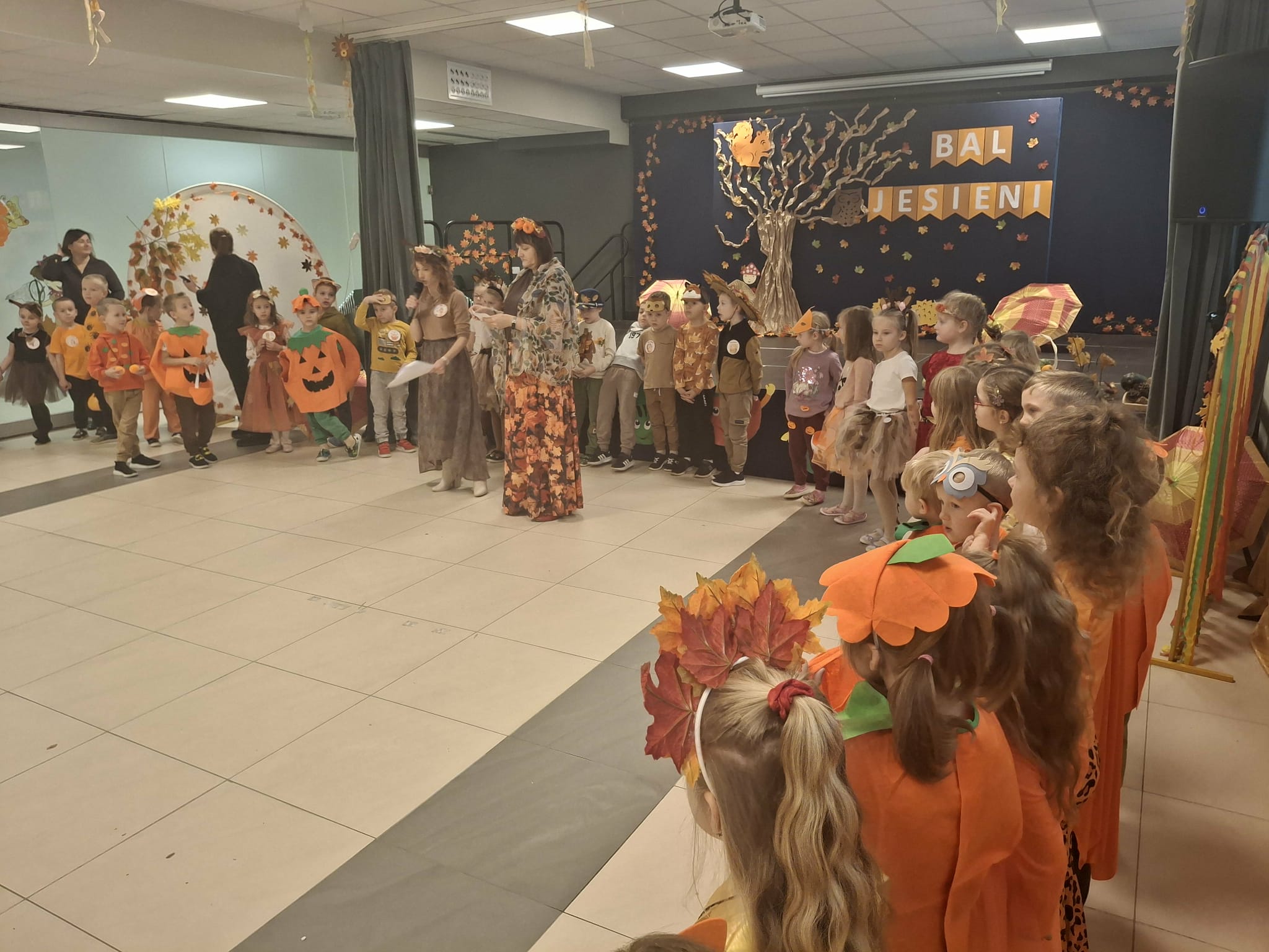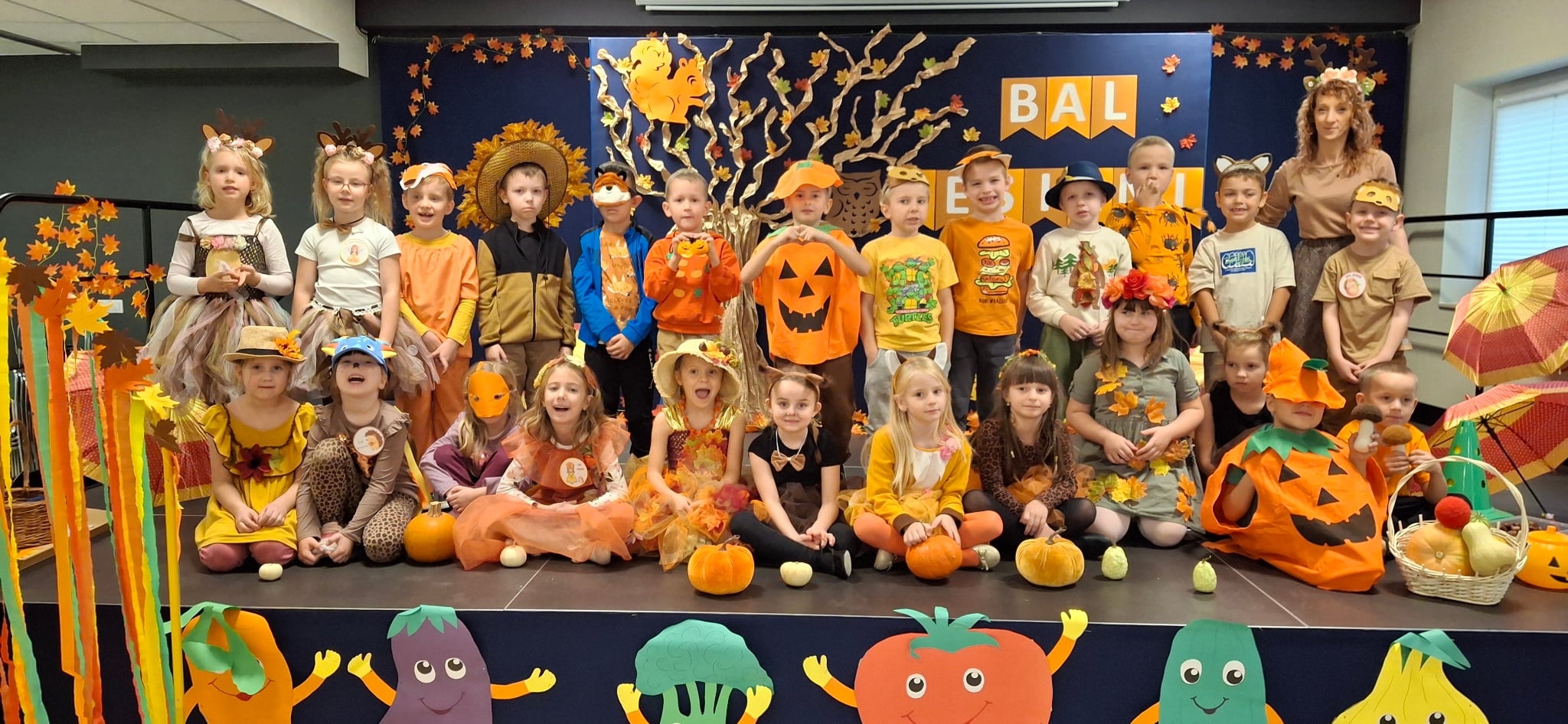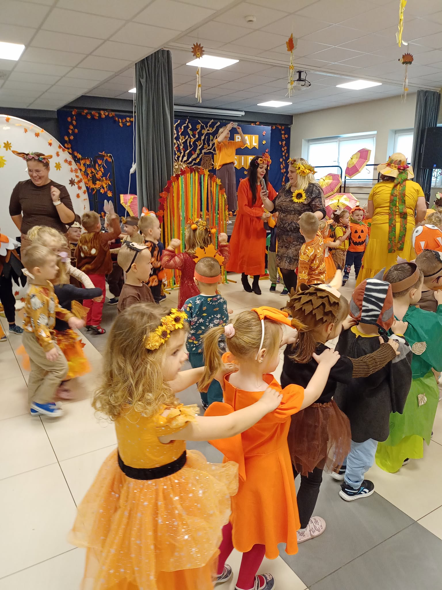 Bal Jesieni w naszym przedszkolu. Dnia 30 października 2025r., naszym przedszkolu odbył się wyjątkowy Bal Jesieni, pełen radości, muzyki i kolorów! Tego dnia w przedszkolu zagościły barwy złotej jesieni, a przedszkolaki zamieniły się w grzybki, dynie, wiewiórki i inne jesienne postacie. Każde dziecko wyglądało wspaniale – serdecznie dziękujemy Rodzicom za przygotowanie tak pomysłowych i pięknych strojów! Podczas balu dzieci wspaniale się bawiły, uczestnicząc w licznych zabawach muzyczno–ruchowych. Nie zabrakło wspólnego śpiewania jesiennych piosenek, śmiechu i spontanicznych tańców. Bal Jesieni był także okazją do nauki poprzez działanie i doświadczenie. Dzieci rozwijały umiejętność współpracy, doskonaliły koordynację ruchową, utrwalały wiadomości o darach i barwach jesieni, a także kształtowały wrażliwość estetyczną i radość z bycia częścią przedszkolnej społeczności. To był naprawdę radosny i kolorowy dzień, który na długo pozostanie w pamięci naszych przedszkolaków!