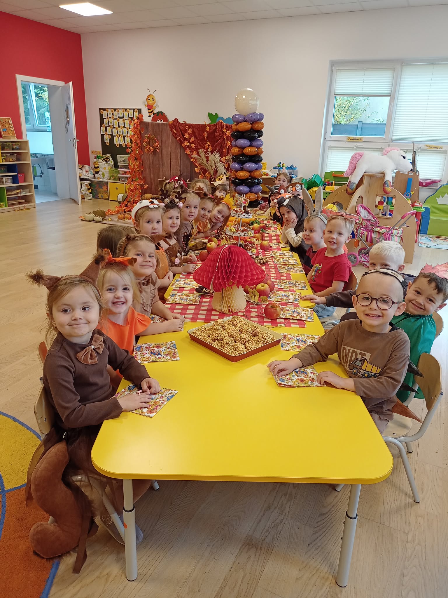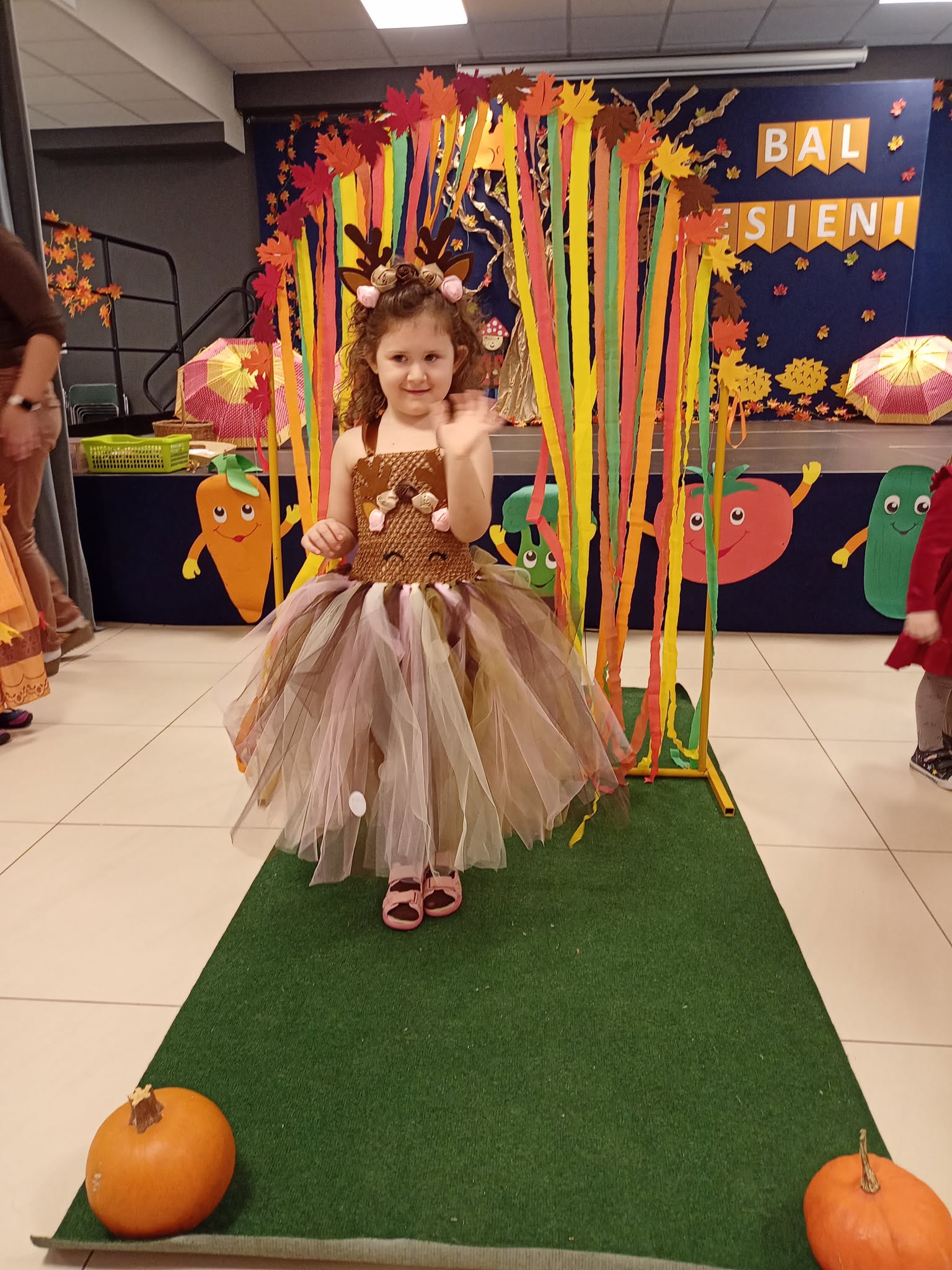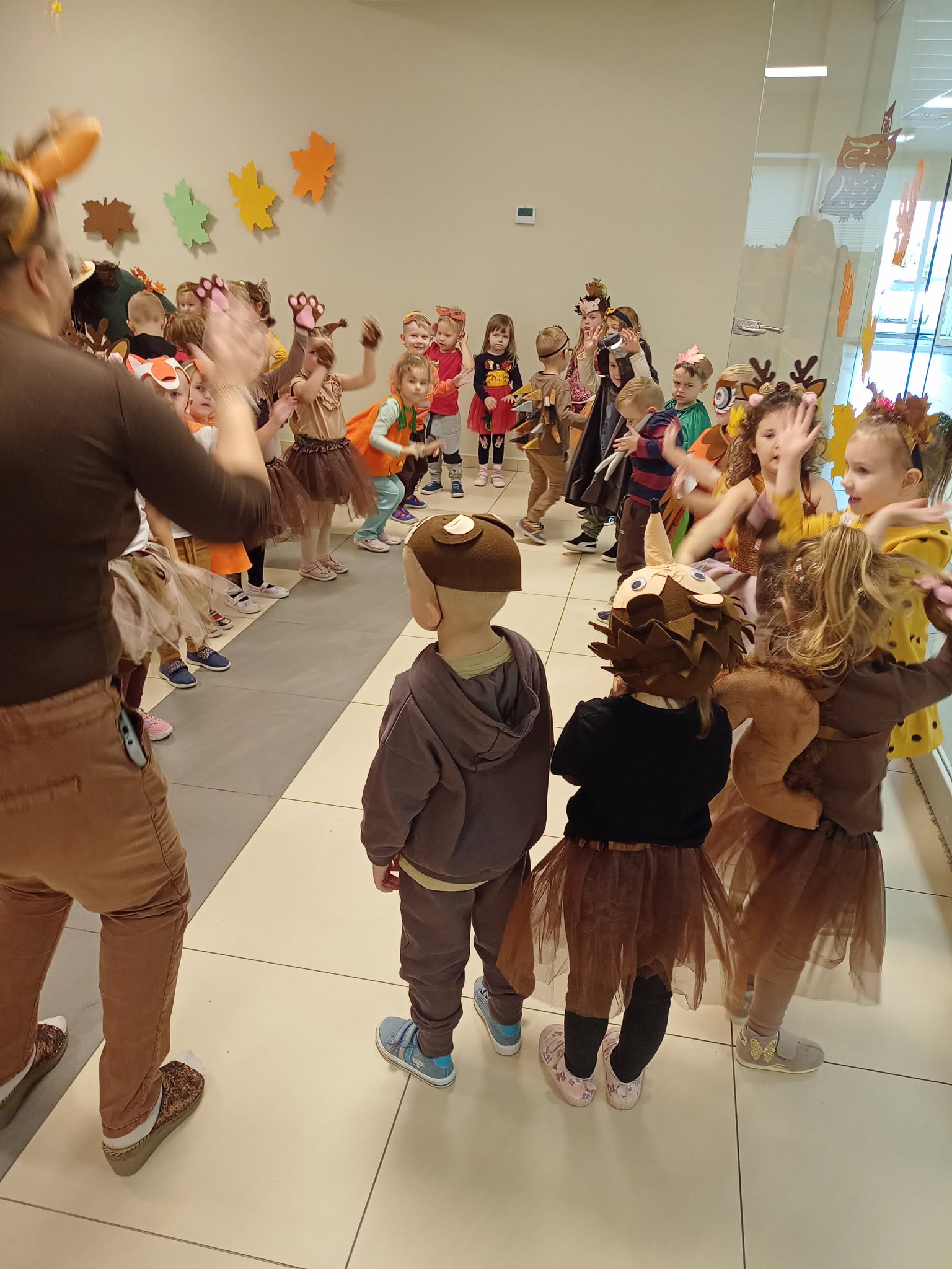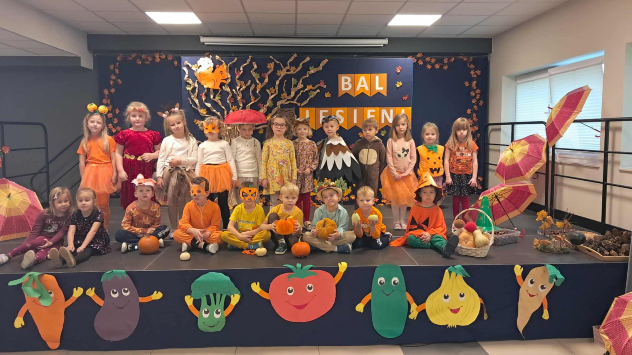 Bal Jesieni w naszym przedszkolu. Dnia 30 października 2025r., naszym przedszkolu odbył się wyjątkowy Bal Jesieni, pełen radości, muzyki i kolorów! Tego dnia w przedszkolu zagościły barwy złotej jesieni, a przedszkolaki zamieniły się w grzybki, dynie, wiewiórki i inne jesienne postacie. Każde dziecko wyglądało wspaniale – serdecznie dziękujemy Rodzicom za przygotowanie tak pomysłowych i pięknych strojów! Podczas balu dzieci wspaniale się bawiły, uczestnicząc w licznych zabawach muzyczno–ruchowych. Nie zabrakło wspólnego śpiewania jesiennych piosenek, śmiechu i spontanicznych tańców. Bal Jesieni był także okazją do nauki poprzez działanie i doświadczenie. Dzieci rozwijały umiejętność współpracy, doskonaliły koordynację ruchową, utrwalały wiadomości o darach i barwach jesieni, a także kształtowały wrażliwość estetyczną i radość z bycia częścią przedszkolnej społeczności. To był naprawdę radosny i kolorowy dzień, który na długo pozostanie w pamięci naszych przedszkolaków!