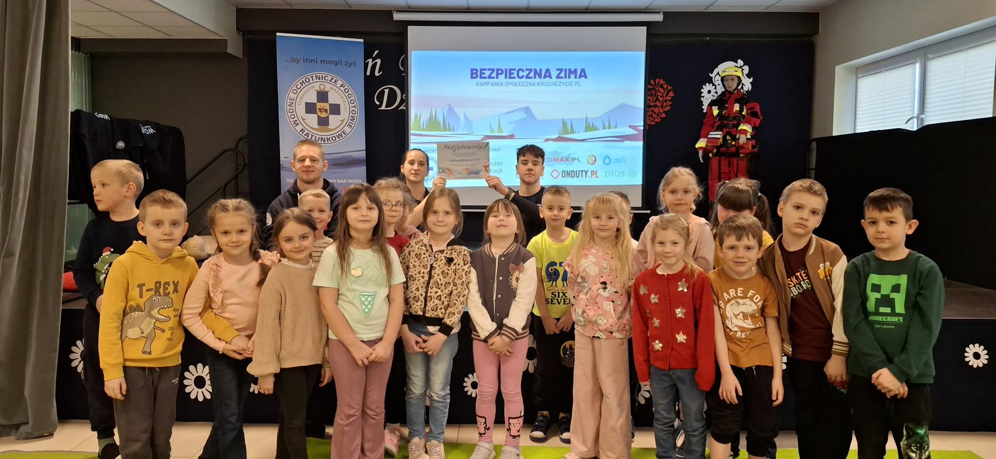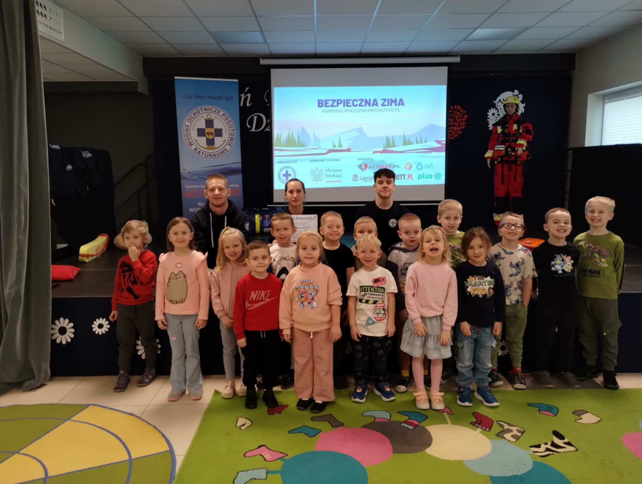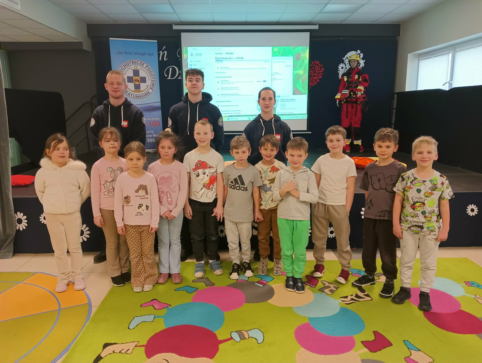 W dniu 30 stycznia 2026r., w naszym przedszkolu odbyło się spotkanie dzieci z ratownikami Wodnego Ochotniczego Pogotowia Ratunkowego (WOPR). Goście w ciekawy i przystępny sposób przekazali przedszkolakom cenne informacje dotyczące bezpieczeństwa podczas ferii zimowych. Spotkanie z ratownikami pozwoliło: kształtować u dzieci właściwe postawy i nawyki związane z bezpieczeństwem, poszerzać wiedzę na temat zagrożeń podczas zimowych zabaw, zapoznać dzieci z pracą ratowników WOPR. Ratownicy omówili zasady bezpiecznego zachowania się na lodzie, przypomnieli o konieczności korzystania z opieki osób dorosłych oraz zaprezentowali podstawowe sposoby reagowania w sytuacjach zagrożenia. Spotkanie wzbudziło duże zainteresowanie dzieci, które chętnie zadawały pytania i brały udział w rozmowie. Serdecznie dziękujemy ratownikom WOPR za poświęcony czas, zaangażowanie oraz cenną lekcję bezpieczeństwa. Ich obecność była dla dzieci nie tylko wartościowym doświadczeniem edukacyjnym, ale również dużą atrakcją