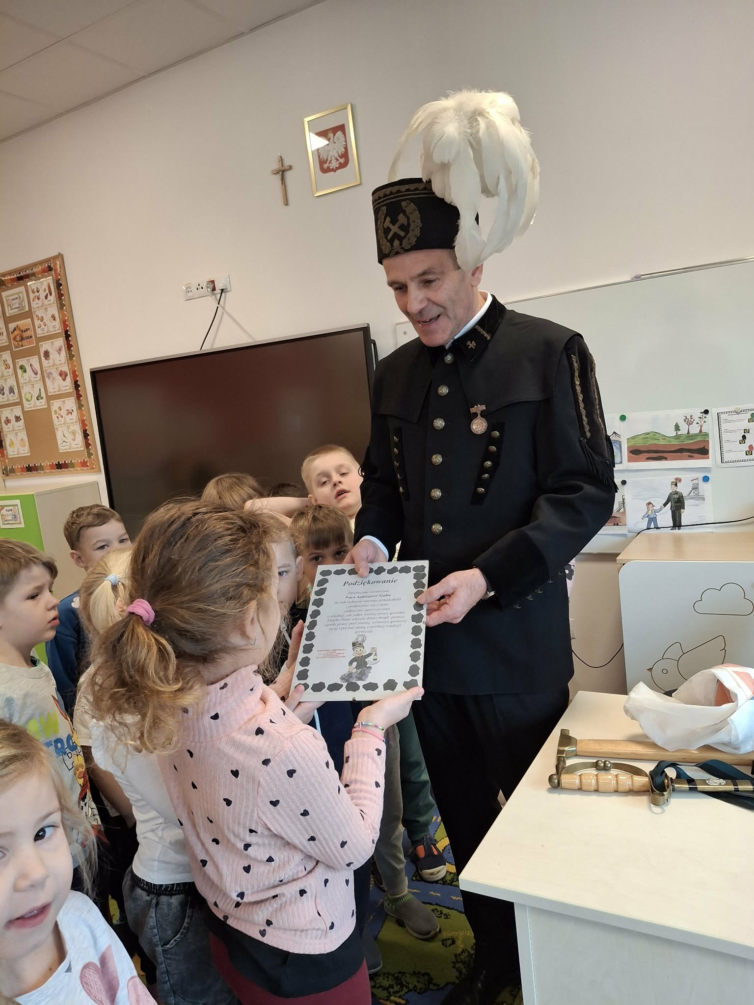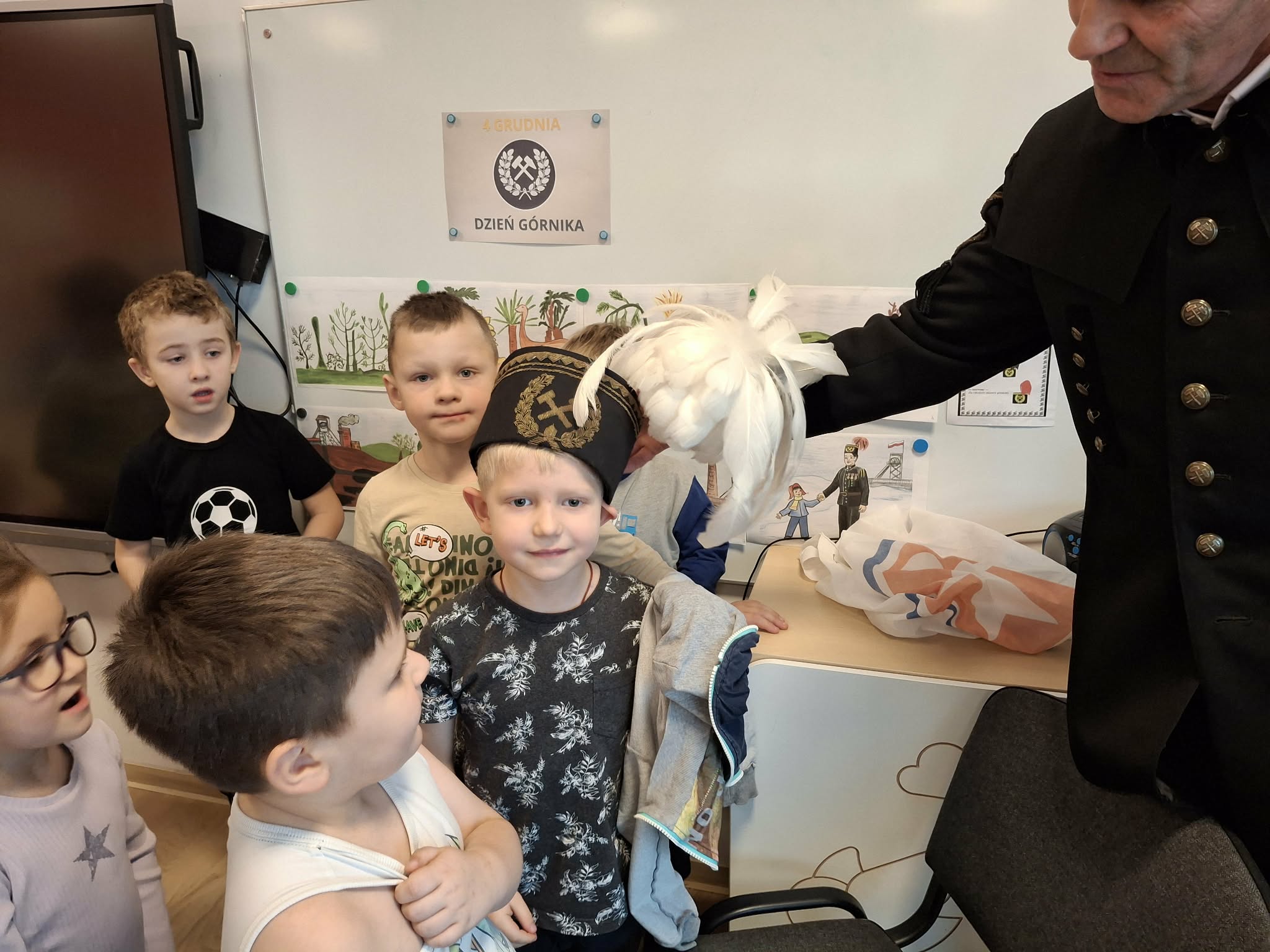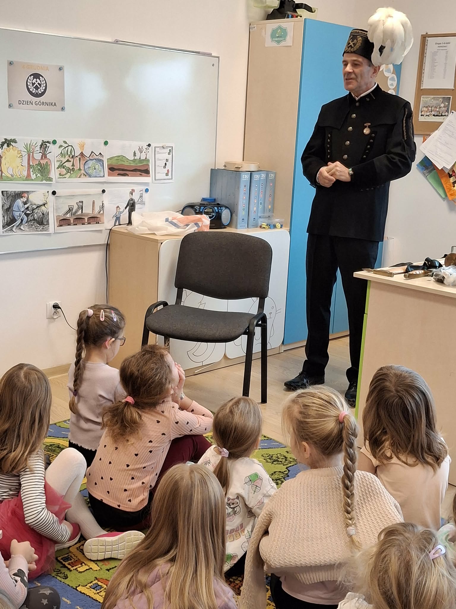 4 grudnia obchodzimy Dzień Górnika, potocznie zwany Barbórką. Chcąc przybliżyć dzieciom trudną i odpowiedzialną pracę w kopalni, zaprosiliśmy do naszego przedszkola pana Andrzeja Szubę, emerytowanego górnika. Nasz gość, ubrany w mundur galowy, opowiedział dzieciom o maszynach górniczych, o codziennej pracy oraz o roboczym i galowym stroju górnika. Spotkanie było bardzo pouczające i przybliżyło dzieciom postać górnika i jego ciężką pracę. Na zakończenie dzieci podziękowały niecodziennemu gościowi za wizytę, złożyły życzenia i wręczyły pamiątkowe podziękowanie.